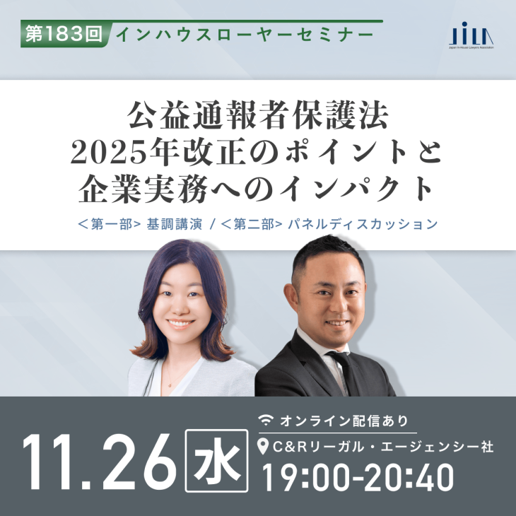2025.10.31|研修会・イベント 2025年11月26日(水)にJILA11月研修会「公益通報者保護法2025年改正のポイントと企業実務へのインパクト」(講師:岩田 朋子 氏(消費者庁 参事官(公益通報・協働担当)室 政策企画専門官、弁護士)、蜂須 明日香 氏(蜂須総合法律事務所 弁護士、元消費者庁 参事官(公益通報・協働担当)室 政策企画専門官)、結城 大輔 氏(のぞみ総合法律事務所弁護士))を開催