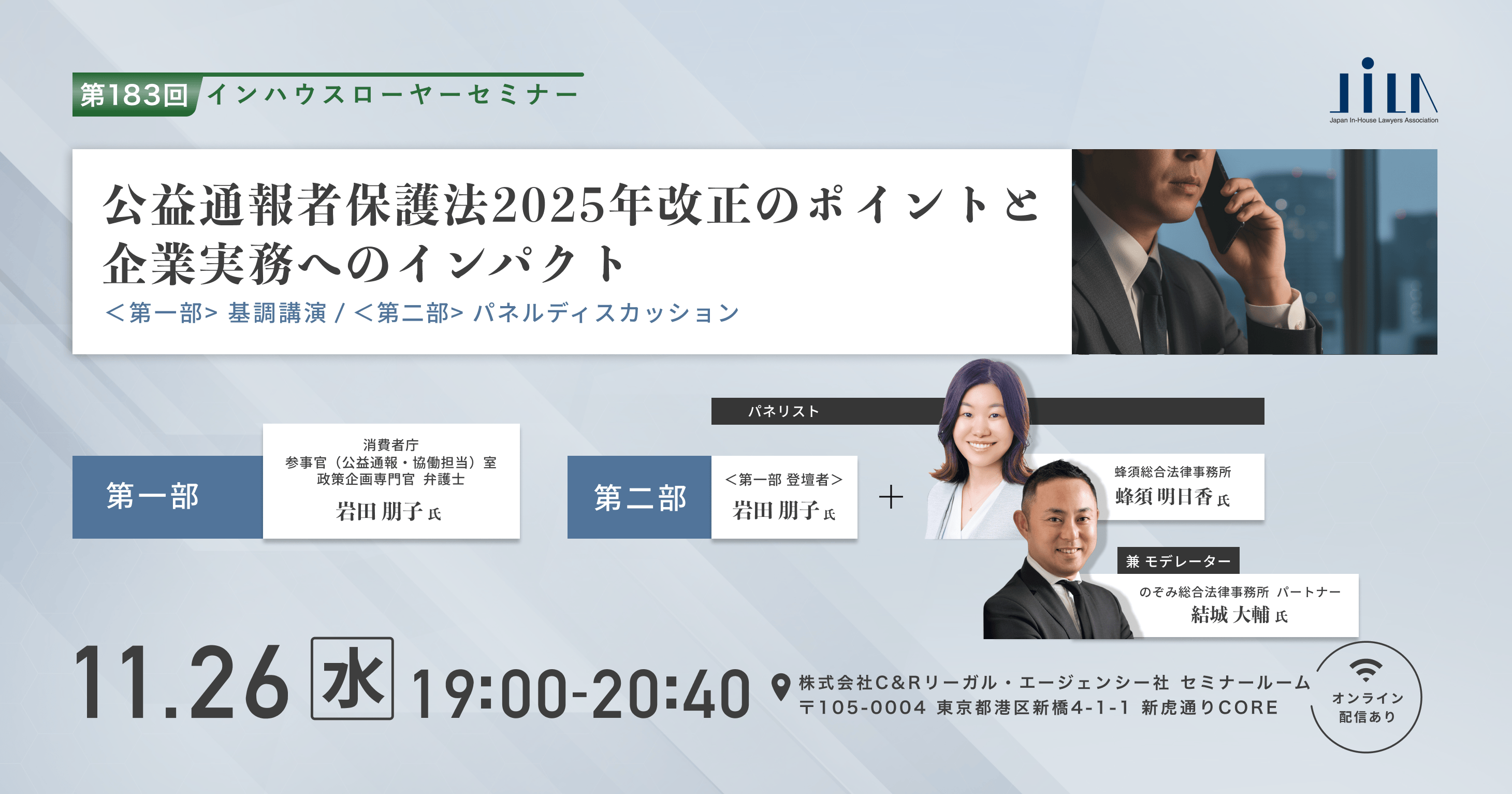 2025年11月26日(水)にJILA11月研修会「公益通報者保護法2025年改正のポイントと企業実務へのインパクト」(講師:岩田 朋子 氏(消費者庁 参事官(公益通報・協働担当)室 政策企画専門官、弁護士)、蜂須 明日香 氏(蜂須総合法律事務所 弁護士、元消費者庁 参事官(公益通報・協働担当)室 政策企画専門官)、結城 大輔 氏(のぞみ総合法律事務所弁護士))を開催